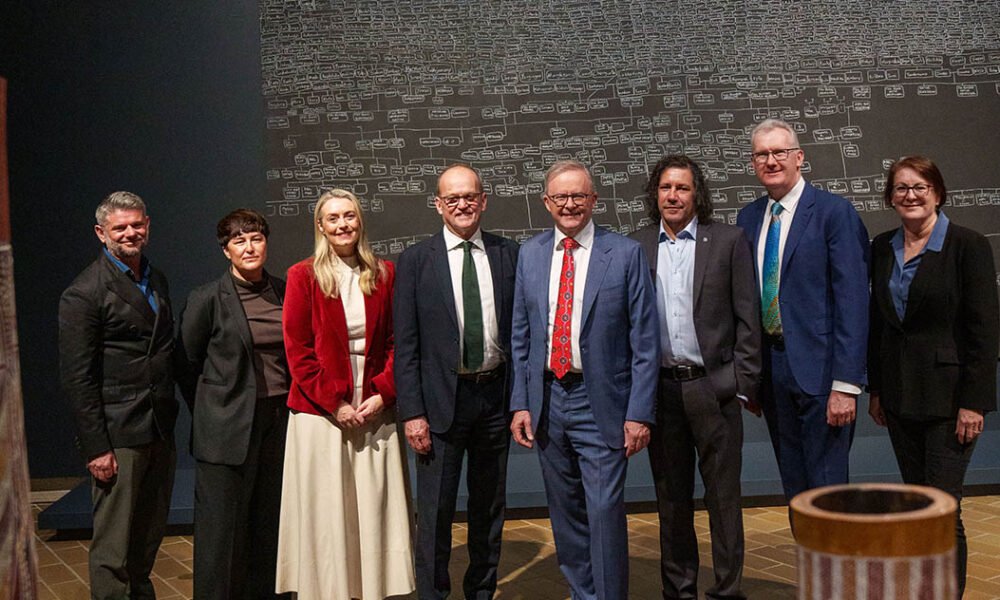 Nick Mitzevich (NGA), Ellie Buttrose, Jodie Haydon, Adrian Collette (CEO Creative Australia), The Hon. Anthony Albanese, Archie Moore, The Hon. Tony Burke and The Hon. Susan Templeman (Special Envoy for the Arts), standing in front of Family Tree by Archie Moore currently on display at the National Gallery of Australia