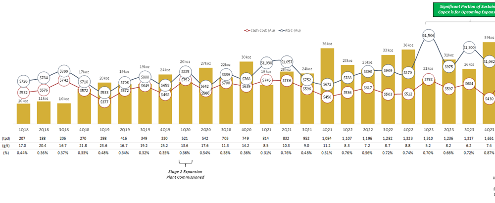 On the Stage 3 and 4 Expansions, 52% of growth capital has been either spent or committed as of April 30, 2024. K92 has completed handover to GR Engineering for the construction of the 1.2 million tpa (“tonnes per annum”) Stage 3 Process Plant, with commissioning of the Stage 3 Process Plant now targeting late-April (previously by end of March 2025) due to a significantly wetter and longer than average rainy season. Fortunately, as this occurred early in the mobilization process, cost variation is minor. Underground, two raise bore rigs are undergoing electrification and will commence boring imminently, with the larger raise bore commencing works for a ventilation raise first followed by the first waste/ore pass. The first waste/ore pass is scheduled to commence boring in Q3 2024.