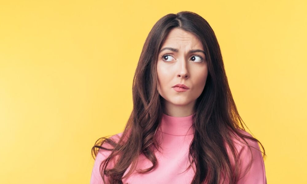 Smart and thoughtful mature woman holding her chin and pondering idea, making difficult decision, … [+]